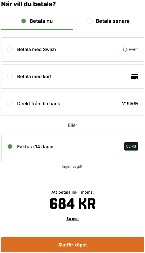 3. Nu återstår bara att välja betalningssätt: “BETALA NU” med kort eller “BETALA SENARE” med 30 dagars faktura.