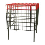 Denna robusta skyddsbur är utformad för att täcka sorkfällor och förhindra att obehöriga eller tamdjur kommer i kontakt med fällan. Med sin konstruktion av svetsat nät och integrerade markspett placeras den enkelt över fällan och fixeras stabilt i marken. Den röda signalfärgen på toppen gör buren synlig ovan jord, vilket minskar risken för oavsiktlig kontakt.