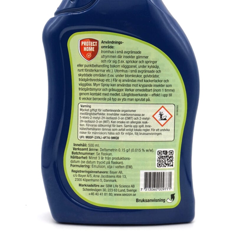 Myrr® Myrspray är ett färdigblandat bekämpningsmedel som används för att hantera förekomst av myror och andra krypande insekter i och omkring hemmet. Produkten verkar genom kontakt och är avsedd att användas på platser där insekter rör sig, exempelvis längs socklar, i sprickor och vid dörrtrösklar. Effekten uppnås vanligtvis kort efter applicering och kan kvarstå på behandlade ytor under en längre tid.