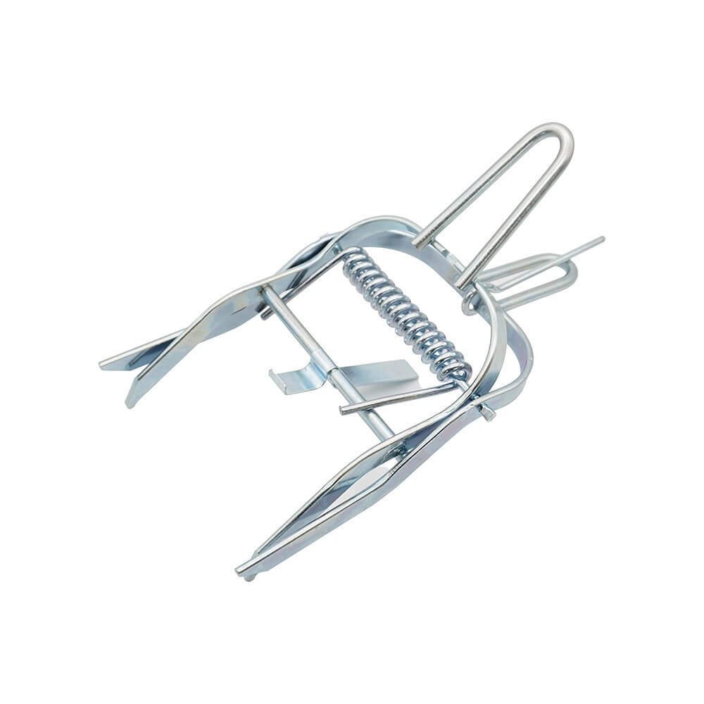 - Pressa ihop handtagen på fällan tills mekanismen är spänd. Se till att låspinnen ligger i mitten av handtagsöglan. Sätt aldrig fingrarna inne i fällans klor.