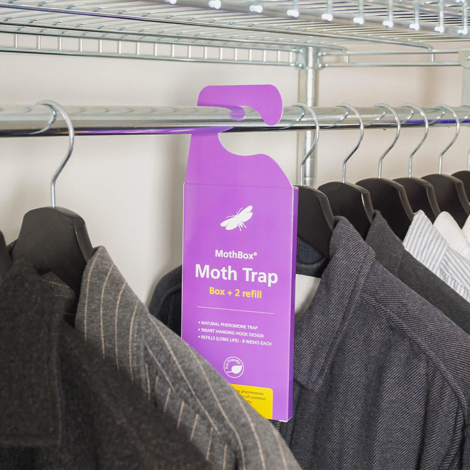 Effektiv klisterfälla med integrerat fermonlockmedel som ger dig möjlighet att övervaka när malfjärilar är aktiva i garderober, byråar eller andra utrymmen där textilier förvaras. Den fungerar som ett visuellt verktyg för att upptäcka potentiella angrepp i tid. Placera fällan nära kläder eller textilier, till exempel i garderober, byråar eller mot väggar där mal ofta rör sig.